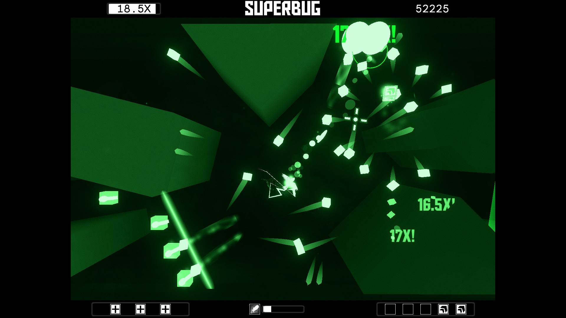 The BOOST is your strongest weapon, a relentlessly fast dashing ability that can obliterate any enemy in your path, and even shatter walls - turning obstacles into explosive weapons. However, the BOOST is a limited resource that must be managed skillfully and in unique ways for each level. Each of SUPERBUG's six (and counting) handcrafted levels are carefully designed to reward mastery, high octane gameplay, and disgusting combos.